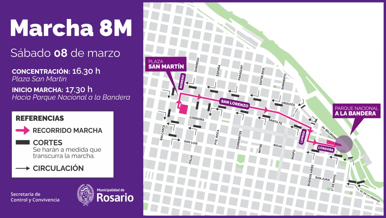 El punto de concentración será la plaza San Martín desde las 16, en tanto se estima que el inicio de la movilización será a las 17 desde plaza San Martín por Moreno, San Lorenzo, Laprida, Córdoba hasta el Parque Nacional a la Bandera (el escenario estará ubicado en Belgrano y Estevez Boero).