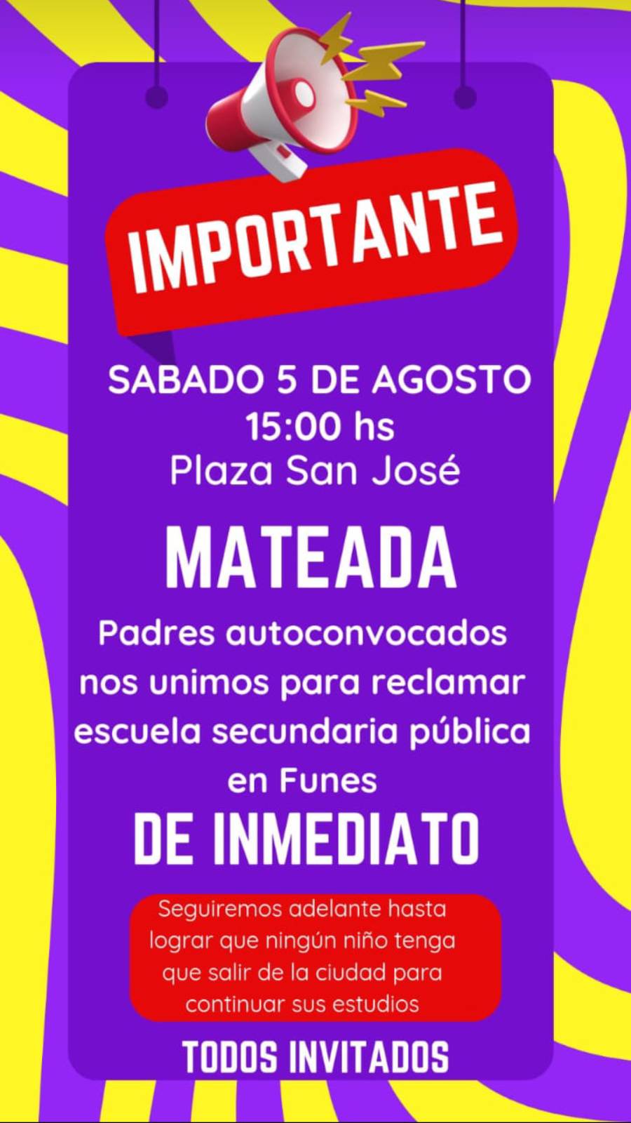 Más de 200 familias autoconvocadas “sin banderas pero con el mismo objetivo y preocupación: el derecho a la educación secundaria pública de sus hijos”, como aclararon, organizaron una mateada para el sábado 5 de agosto en la plaza San José de Funes, a las 15, y así juntar firmas a la carta que enviarán al Ministerio de Educación con el reclamo de una escuela secundaria pública en la ciudad. Si bien saben de los tiempos aletargados del Ministerio, por el momento se conforman con la creación de cargos para el anexo de la escuela secundaria 398, Islas Malvinas, ubicado en José Ingenieros 3750. El espacio, hasta hace poco ocupado por el jardín 349 que ya se mudó a su edificio propio, quedó vacante y podría ocuparse por dos divisiones de primer año en el turno mañana. Cabe señalar que, a groso modo, los padres y madres autoconvocados afirman que en diciembre terminarían séptimo grado unos 300 alumnos de las escuelas públicas de la ciudad y, claramente, no habrá lugar para todos en marzo próximo. Y la problemática crece.