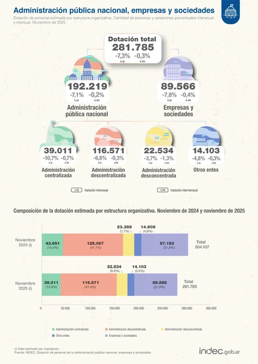 La dotación de personal de la administración pública nacional (APN), empresas y sociedades se redujo en noviembre y se perdieron 785 empleos, lo que representó una baja de 0,3% contra octubre y del 7,8% contra noviembre del 2024. En relación a la asunción de Javier Milei -diciembre 2023- la pérdida asciende a 59.688 puestos de trabajo.