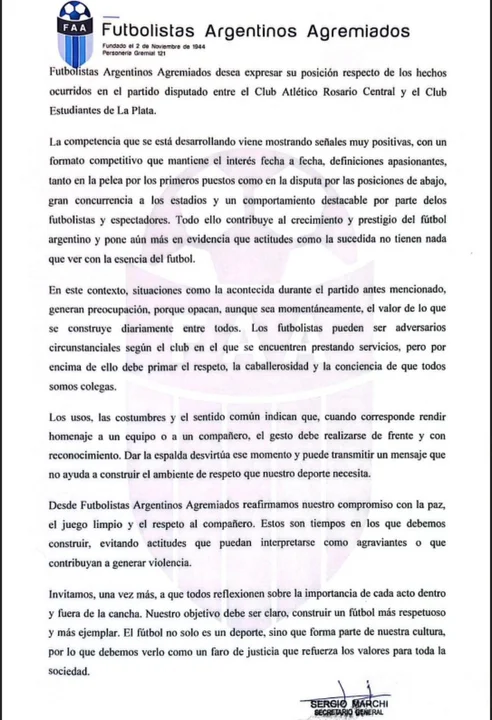 El presidente de Futbolistas Argentinos Agremiados (FAA), Sergio Marchi, decidió salir al rescate institucional con un repudio al pasillo de Estudiantes a Rosario Central que sirve más como gesto político que como defensa del fútbol argentino.