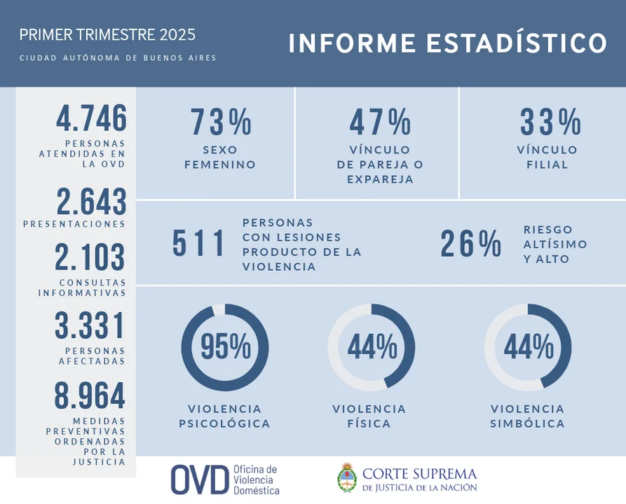 Las denuncias por violencia doméstica en la Argentina aumentaron un 9% en el primer trimestre del 2025 y el 73% de las afectadas son mujeres, conforme a un informe dado a conocer por la Corte Suprema de Justicia de la Nación.