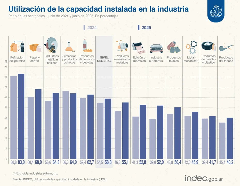 En junio, la utilización de la capacidad instalada en la industria fue del 58,8%, superando el número del mismo mes del 2024 (54,5%), pero sigue por debajo del 60%, según difundió el Instituto Nacional de Estadísticas y Censos (INDEC).