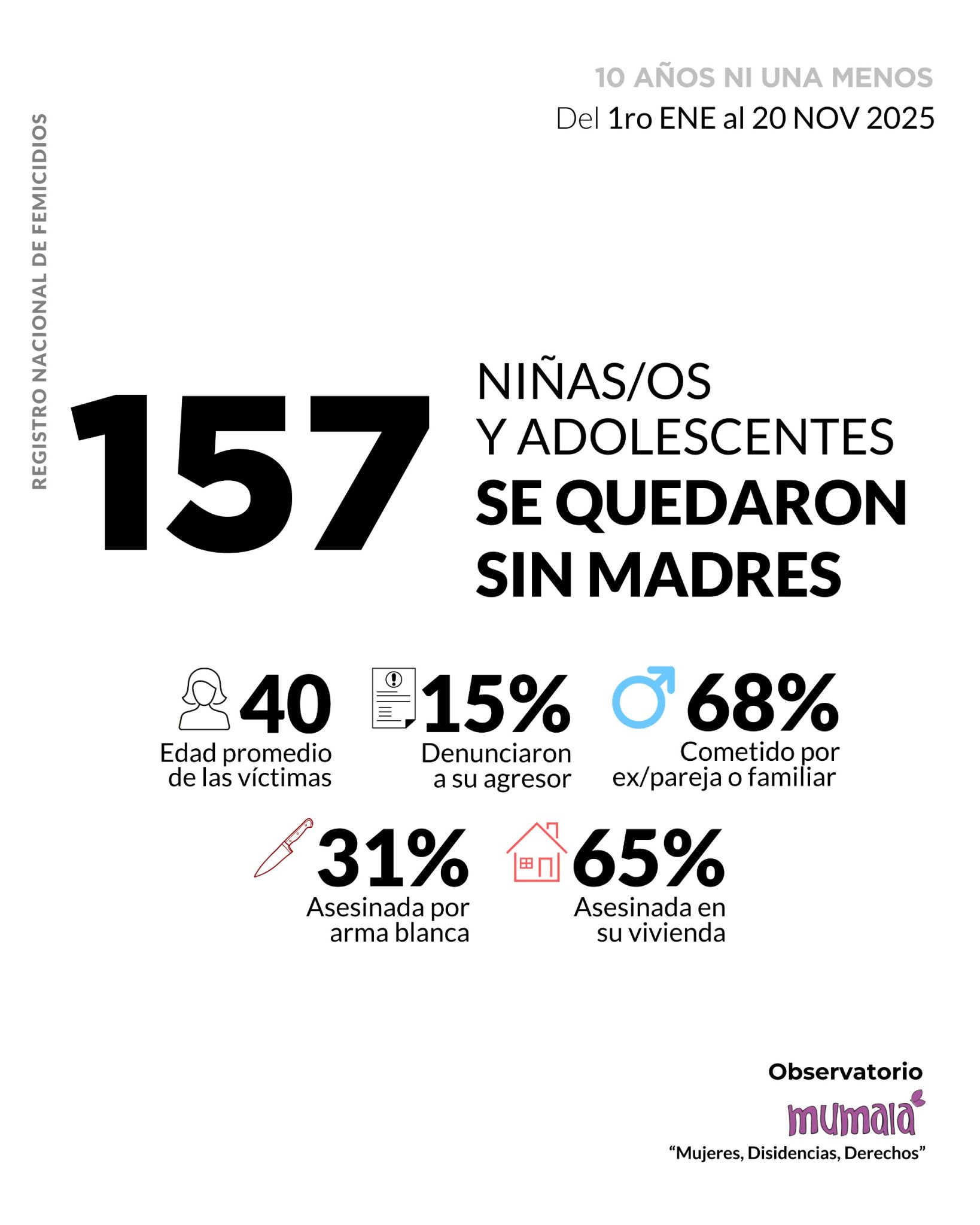 La cifra de violencia extrema no termina allí: se registraron 901 intentos de femicidio y 36 casos siguen en investigación, mientras que 157 niños, niñas y adolescentes quedaron huérfanos de madre.