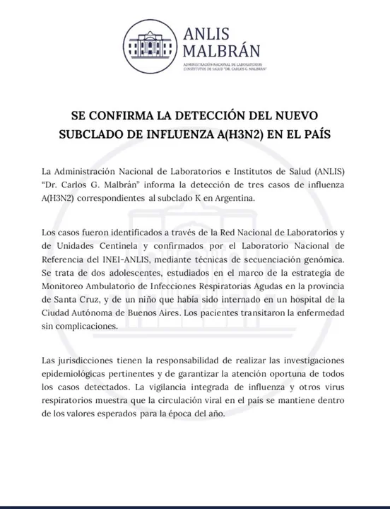 La Administración Nacional de Laboratorios e Institutos de Salud (ANLIS) “Dr. Carlos G. Malbrán” confirmó la detección de tres casos de influenza A (H3N2) correspondientes al subclado K en Argentina, identificados mediante técnicas de secuenciación genómica, según supo la Agencia Noticias Argentinas.