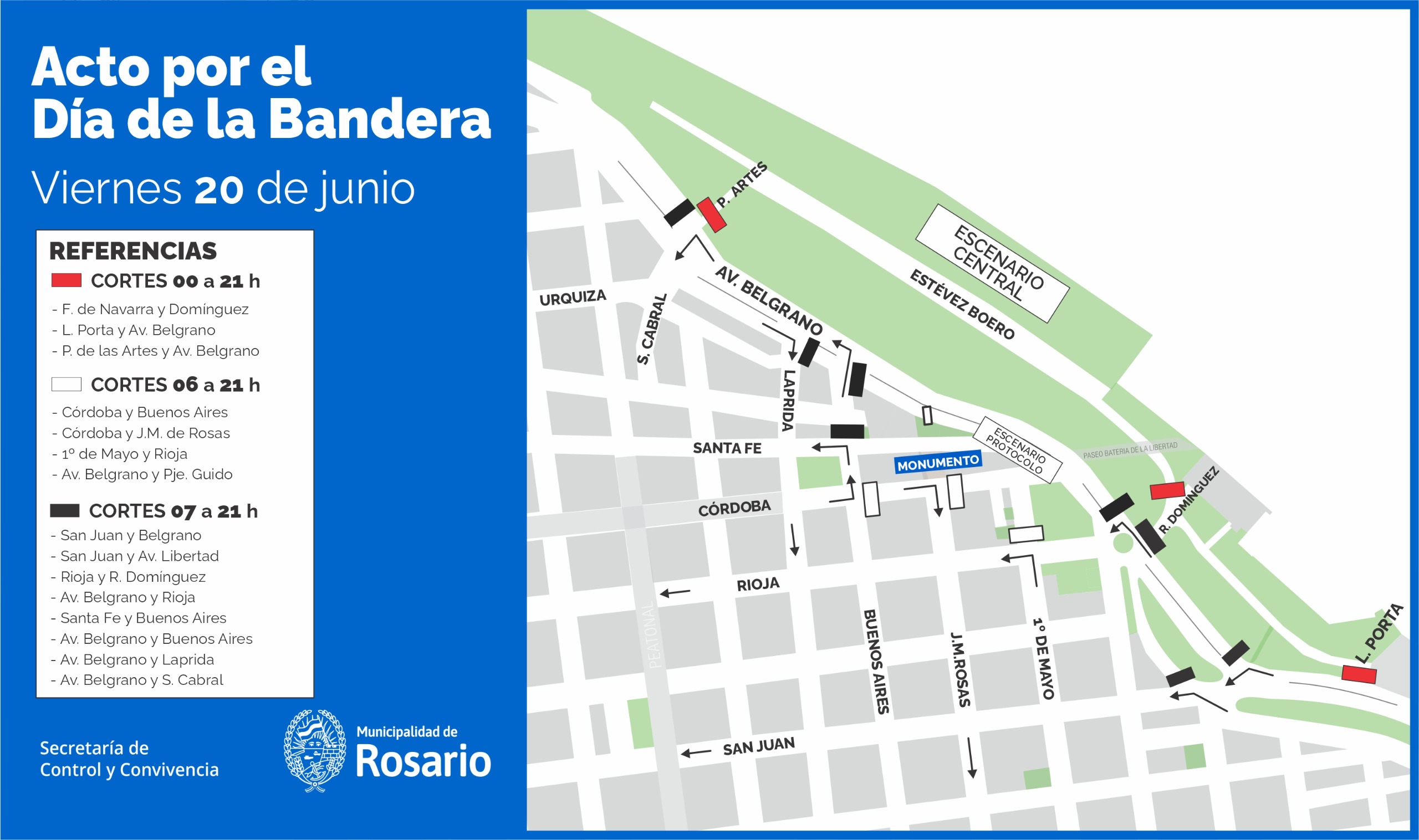 Con motivo del tradicional acto conmemorativo por el Día de la Bandera, la Municipalidad de Rosario anunció cortes de tránsito en la zona del Monumento y el Parque Nacional a la Bandera durante la jornada de este viernes 20 de junio.