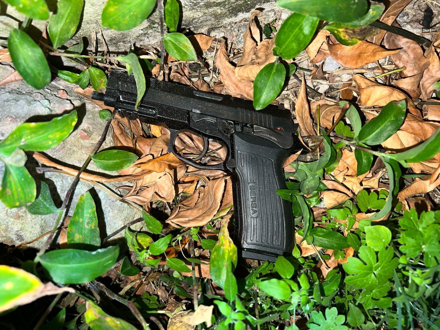 Durante el escape, el acompañante de la moto –según consta en el parte policial– exhibió y apuntó un arma de fuego contra el personal policial, lo que motivó que uno de los agentes efectuara un disparo con escopeta desde el móvil en movimiento. Posteriormente, el mismo sospechoso arrojó el arma en la vereda este de Garzón al 2900, donde más tarde sería hallada una pistola calibre 9 mm.
