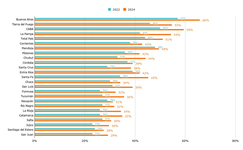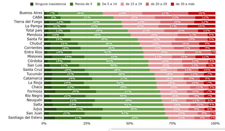 Buenos Aires encabeza el ranking con un 66% de estudiantes que acumulan al menos 15 faltas, seguida por la Ciudad de Buenos Aires (59%), Tierra del Fuego (55%) y La Pampa (54%). En el otro extremo, Santiago del Estero (28%), San Juan (29%) y Jujuy (30%) presentan niveles más bajos de ausentismo, según lo informado por los estudiantes. ​