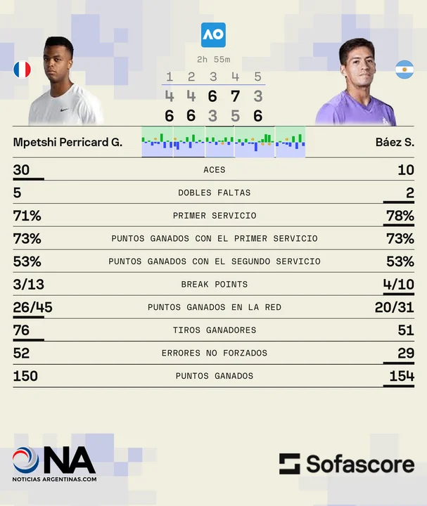 El argentino continuó demostrando su gran estado de forma en el 2026 durante los dos primeros sets ante el francés. Sin conceder ningún servicio, Báez logró quebrar el saque de su oponente en el primer asalto para llevarse el mismo con un sólido 6-4 ante un Mpetshi Perricard que contaba con un potente servicio y logró 12 puntos por aquella vía.