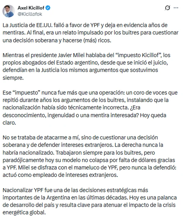En su mensaje, Kicillof defendió el proceso de estatización llevado adelante en 2012, al que calificó como una medida “estratégica” para recuperar la soberanía energética, y sostuvo que la resolución judicial respalda la postura histórica del Estado argentino frente a los reclamos de los fondos litigantes.