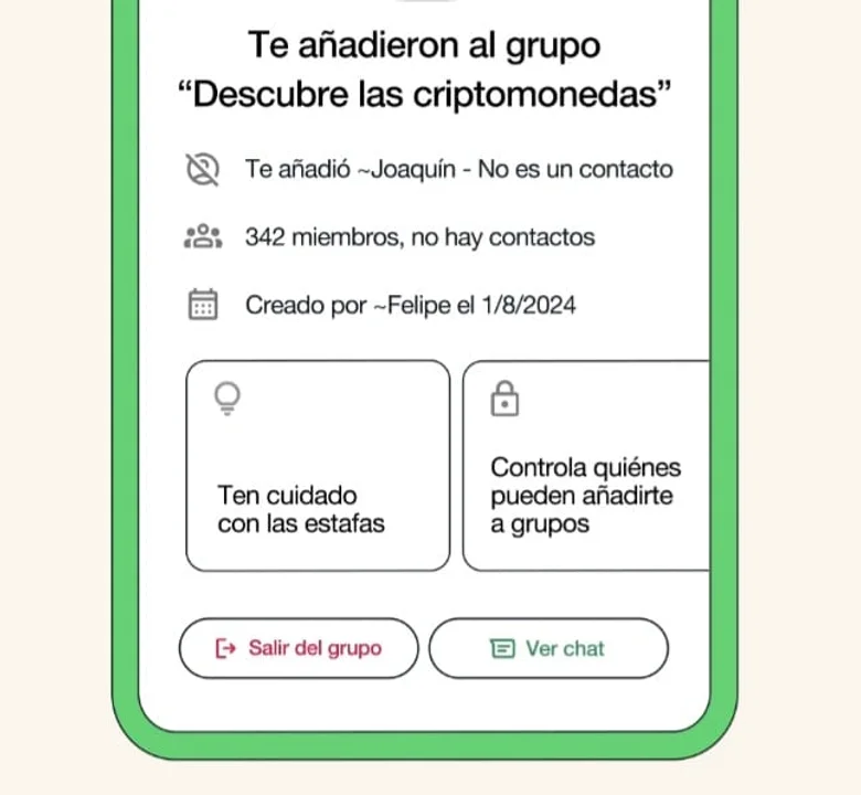 Cuando alguien que no está guardado en los contactos añade a otra a un grupo, la app muestra su información para que se pueda evaluar si se desea quedarse. De esta manera, se tiene una capa extra de seguridad antes de compartir mensajes y archivos en un entorno desconocido.