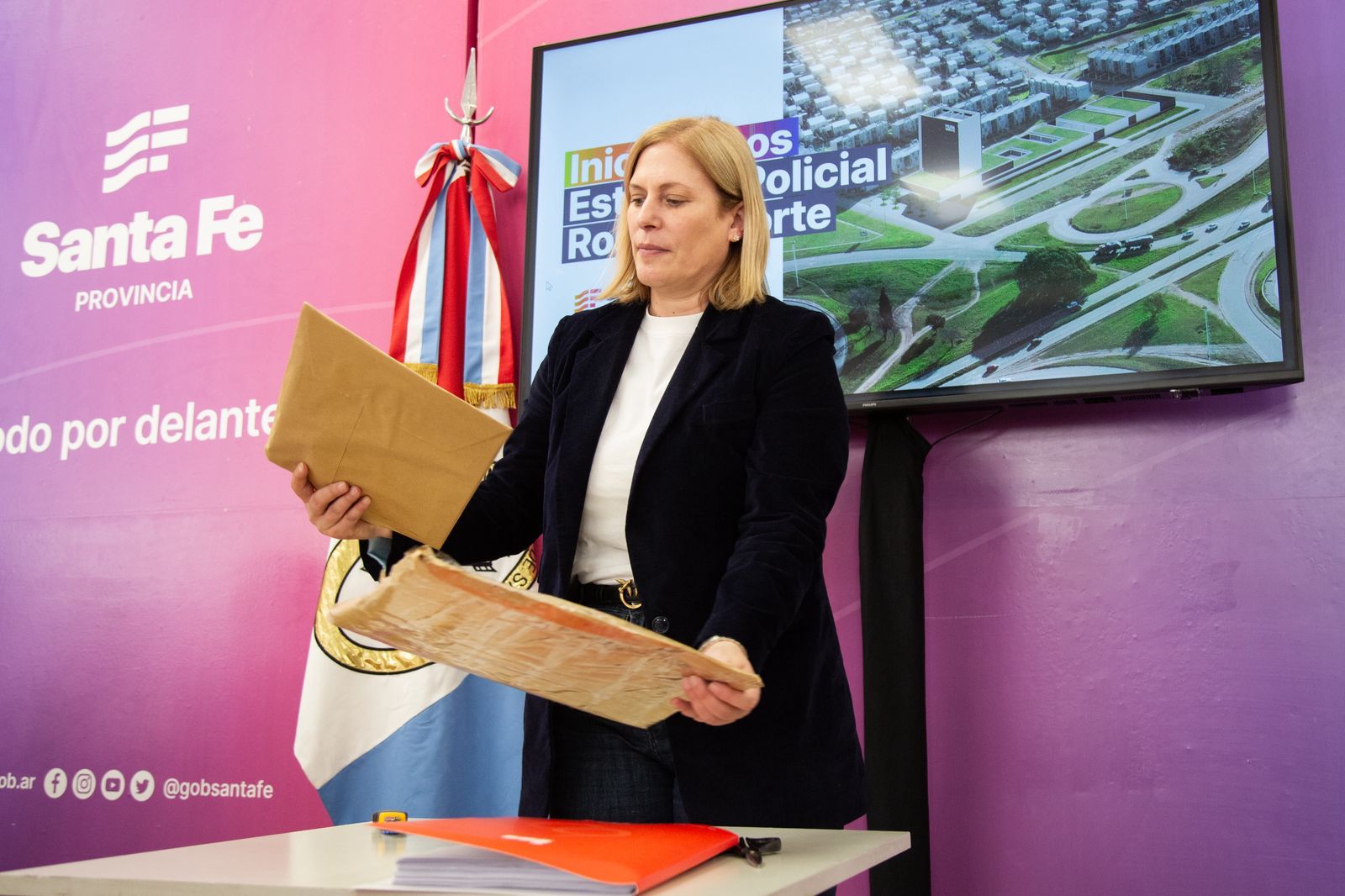 La vicegobernadora Gisela Scaglia, junto al ministro de Justicia y Seguridad, Pablo Cococcioni, encabezó este jueves en Rosario la apertura de sobres con 14 ofertas económicas para la construcción de la Estación Policial Norte y dos propuestas para la adquisición de 600 camionetas destinadas al patrullaje en toda la provincia.