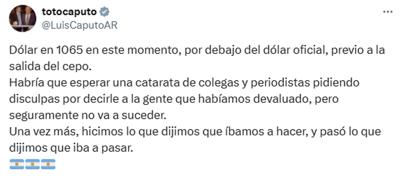 “Dólar en $ 1.065 en este momento, por debajo del dólar oficial, previo a la salida del cepo. Habría que esperar una catarata de colegas y periodistas pidiendo disculpas por decirle a la gente que habíamos devaluado, pero seguramente no va a suceder”, posteó el ministro en sus redes sociales”, dijo Caputo, en su red “X”.