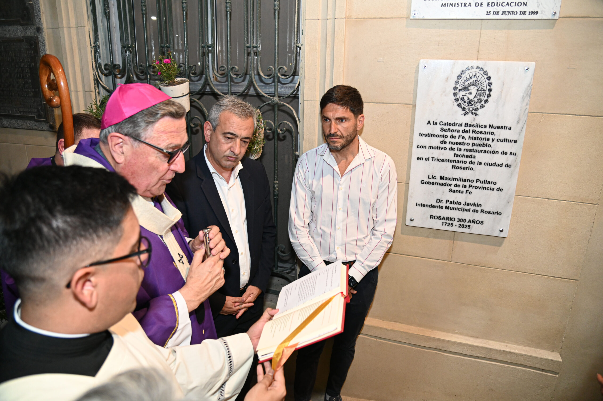 Paralelamente, y al concluir la tradicional misa de los domingos, el intendente junto al gobernador y al Arzobispo de Rosario, monseñor Eduardo Martin, procedieron a descubrir una placa conmemorativa emplazada en el patio original de la Catedral, que lleva la inscripción ‘A la Catedral Basílica Nuestra Señora del Rosario, testimonio de Fe, historia y cultura de nuestro pueblo, con motivo de la restauración de su fachada en el Tricentenario de la ciudad de Rosario’ y la firma de Javkin y de Pullaro.