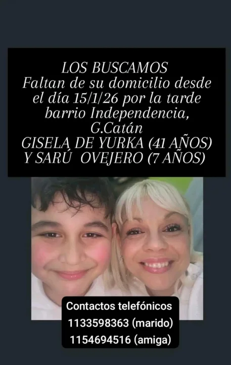 Anteriormente, la familia de ambos difundió un comunicado en donde pudieron: “Los buscamos. Faltan de su domicilio desde el día 15/1/26 por la tarde barrio Independencia, González Catán. Gisela de Yurka, 41 años, y Sarú Ovejero, de 7”.