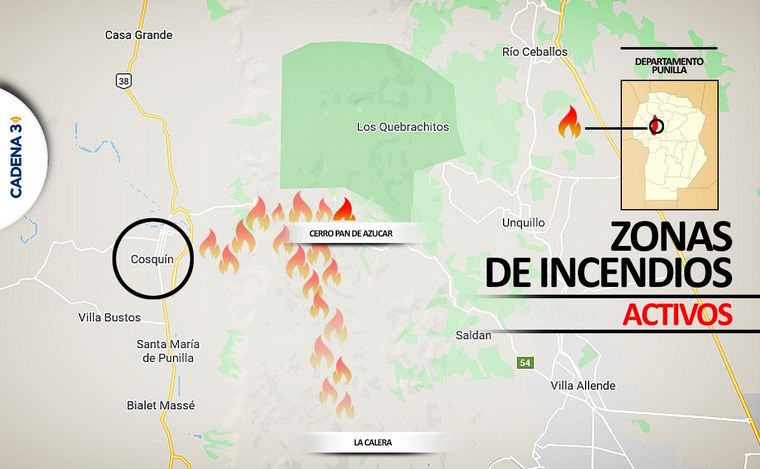 Los incendios activos en la provincia de Córdoba, de acuerdo a un relevamiento realizado por Cadena 3, son dos. El más grande comenzó en Copacabana, en el departamento Ischilín, y se extendió hacia el Valle de Punilla, donde la zona más afectada es la que se encuentra entre Los Terrones y Ongamira.