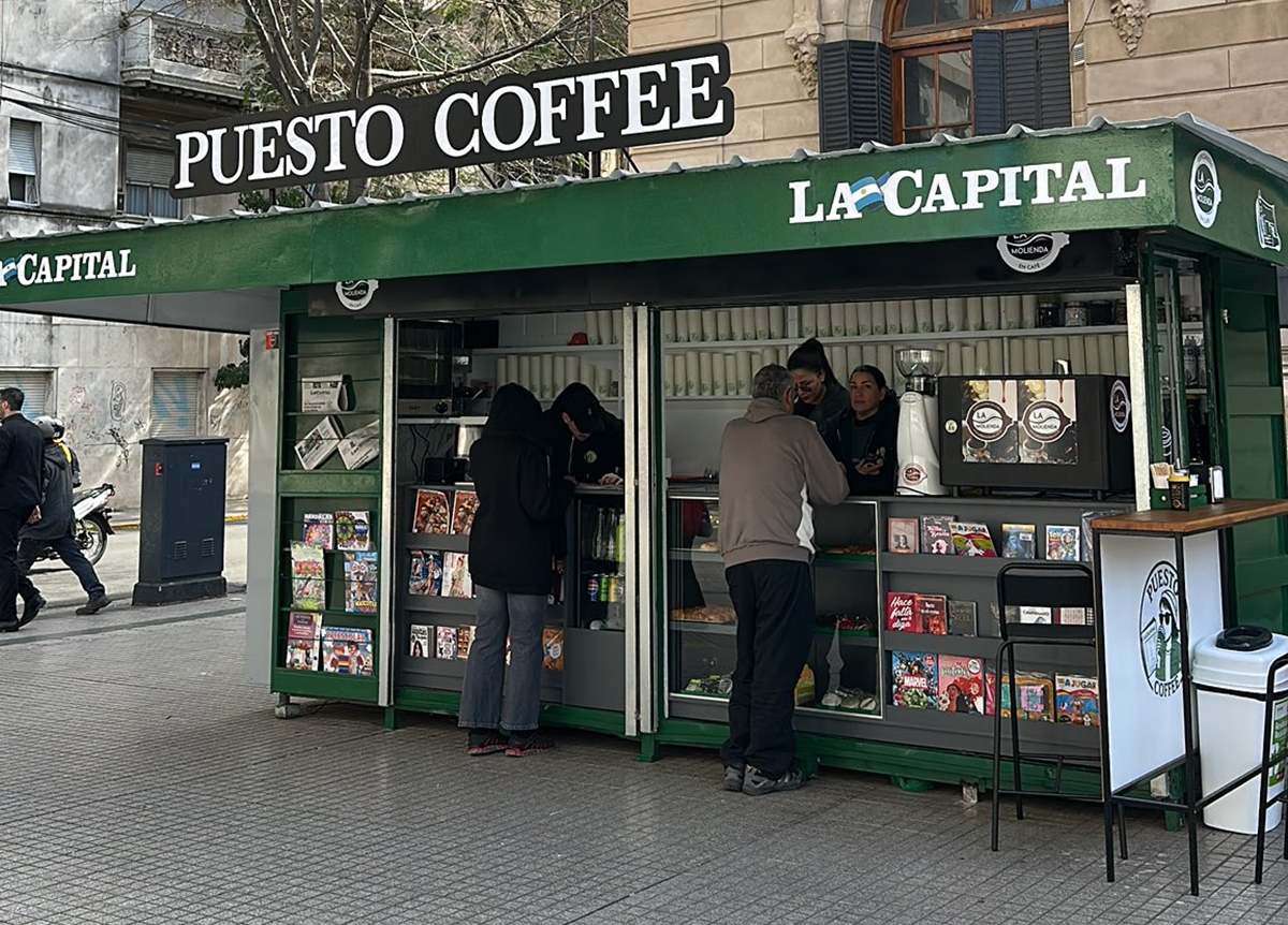 En Rosario abrió esta semana en la esquina de Córdoba y Balcarce, la primera prueba piloto de kiosco de diarios que suma cafetería en la ciudad: Puesto Coffee.