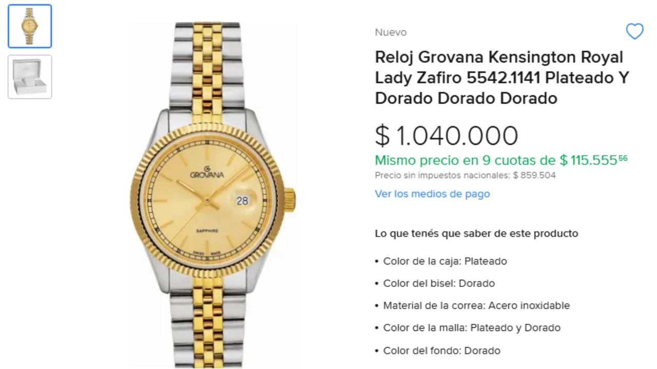 Según supo Noticias Argentinas, el reloj en cuestión es un modelo que estaría fuera de catálogo. Sin embargo, en Mercado Libre se ofrece un modelo muy similar, el Grovana Kensington Royal Lady Zafiro, por un precio de $1.040.000, lo que equivale a unos 788 dólares al cambio paralelo, cifra que coincide con la declaración de la funcionaria.