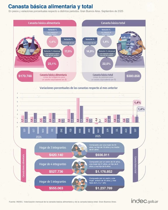 De esta manera, la canasta básica alimentaria (CBA) y la total (CBT) se incrementaron un 1,4% con respecto a agosto del 2025.
