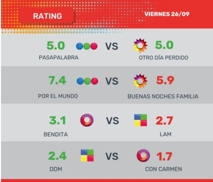 En otros mano a mano Bendita le ganó LAM, Por el Mundo a Buenas Noches Familia y DDM a Con Carmen.