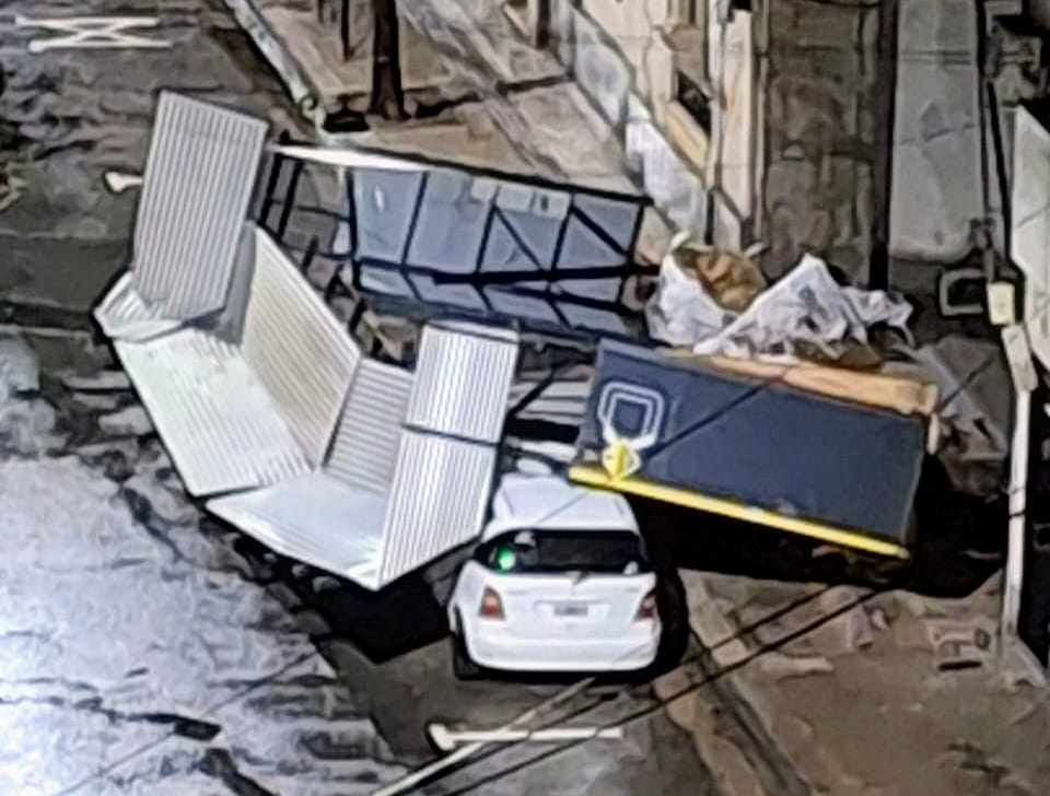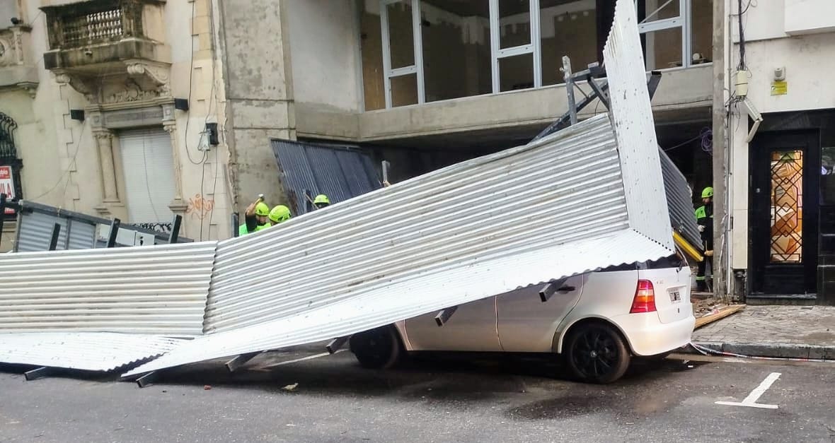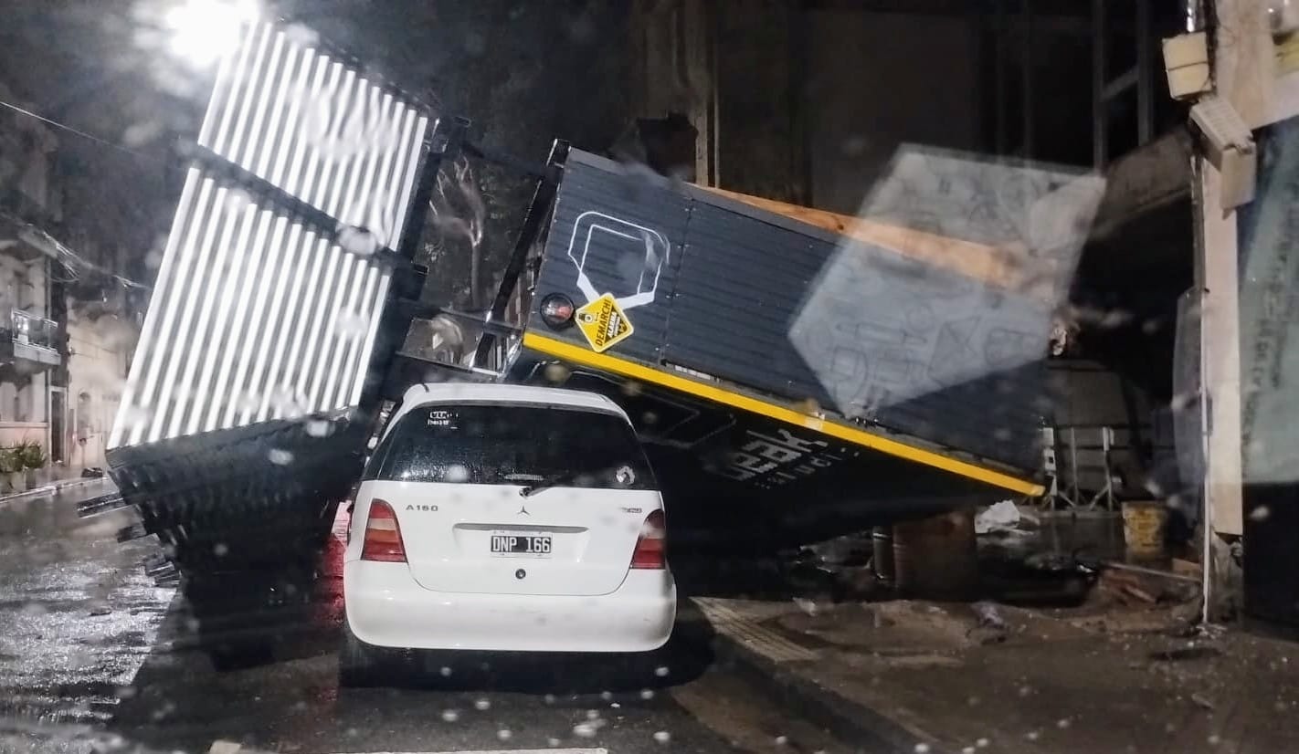 Este miércoles por la madrugada se desprendió una estructura metálica de una obra en construcción en calle Italia al 800 que terminó arriba de un auto estacionado debido a las ráfagas de viento de hasta 75 kilómetros por hora que azotan la ciudad.