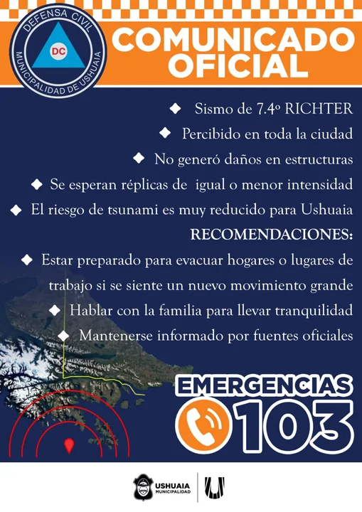 Defensa Civil de Ushuaia sacó un comunicado para dar tranquilidad luego del fuerte sismo en Chile y dio recomendaciones para la población ante las continuas informaciones que circulan, muchas de las cuales pueden ser erróneas.