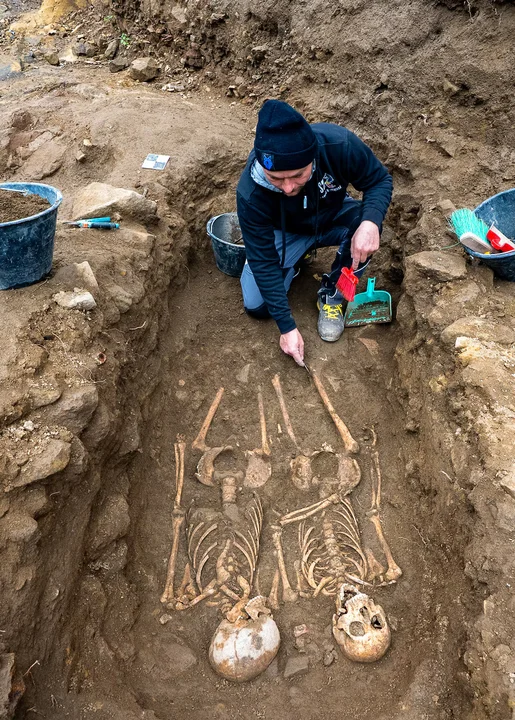 Los investigadores también hallaron alrededor de 50 esqueletos humanos. Las primeras observaciones realizadas por antropólogos indican que la mayoría pertenecen a hombres de entre 20 y 40 años de edad, con una constitución física robusta. En algunos casos se detectó un clavo colocado a la altura del pecho, una práctica ritual documentada en la antigüedad y vinculada a creencias destinadas a alejar el mal en el más allá.