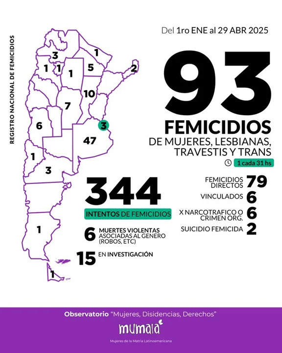 Según el documento, en apenas 4 meses hubo 93 femicidios (1 cada 31 horas) y 344 intentos; asimismo se constató que el 71% de los femicidios ocurrieron en la vivienda de la víctima: “El lugar que debería ser el más seguro, es el más letal”, aseguraron desde MuMaLá.