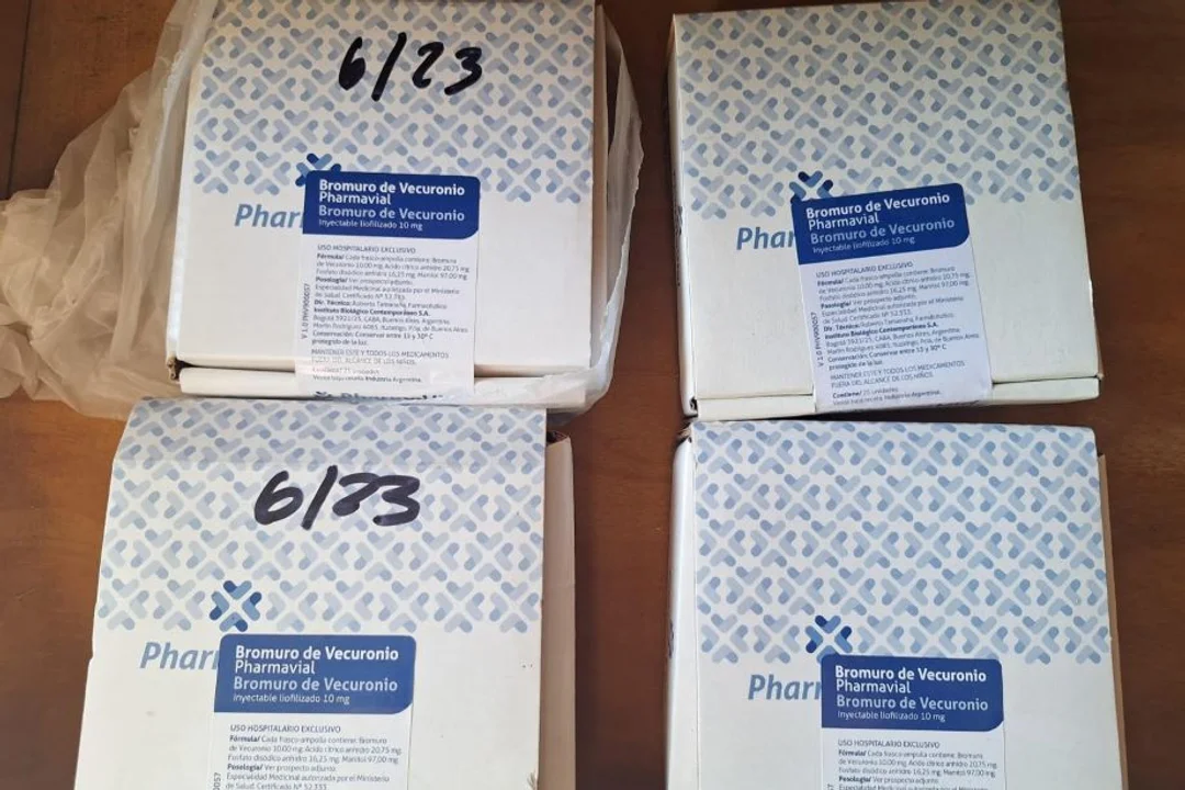 También encontraron cuatro cajas con la leyenda bromuro de vecuronio Pharma Vial de 10 miligramos, cada una contenía 24 frascos -un total de 96 frascos-. En otro sector de la casa se encontró un pack de 30 cajas, que contenían siete comprimidos cada una, con la leyenda Furotral Furosemida, 40 miligramos.