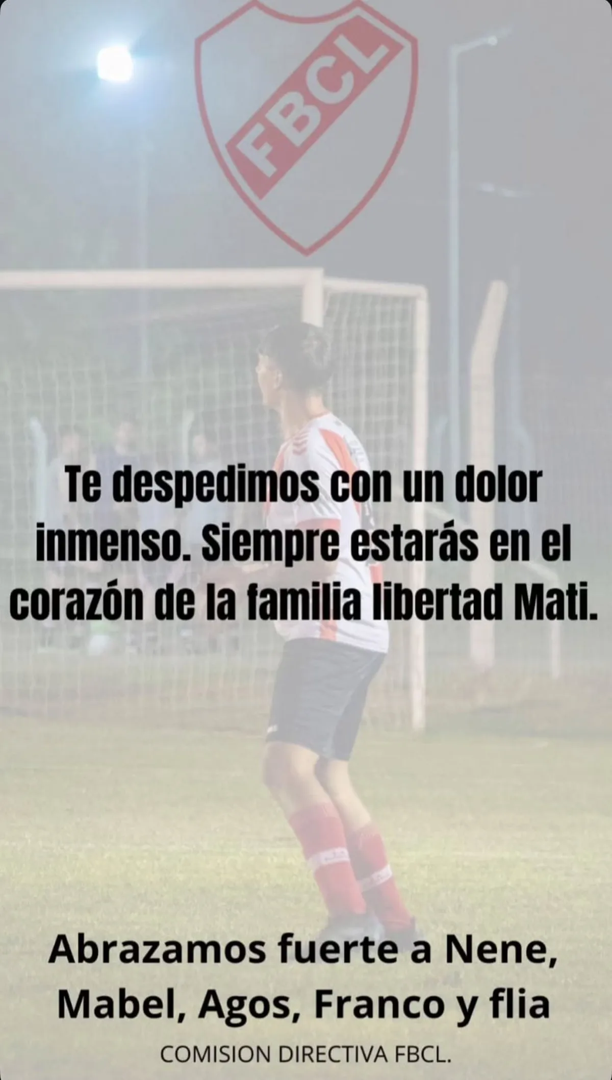 A través de sus redes sociales, el Club Libertad de Nelson expresó el pesar de la institución con un mensaje sentido: “Te despedimos con un dolor inmenso. Siempre estarás en el corazón de la familia Libertad, Mati. Abrazamos fuerte a Nene, Mabel, Agos, Franco y flia.”