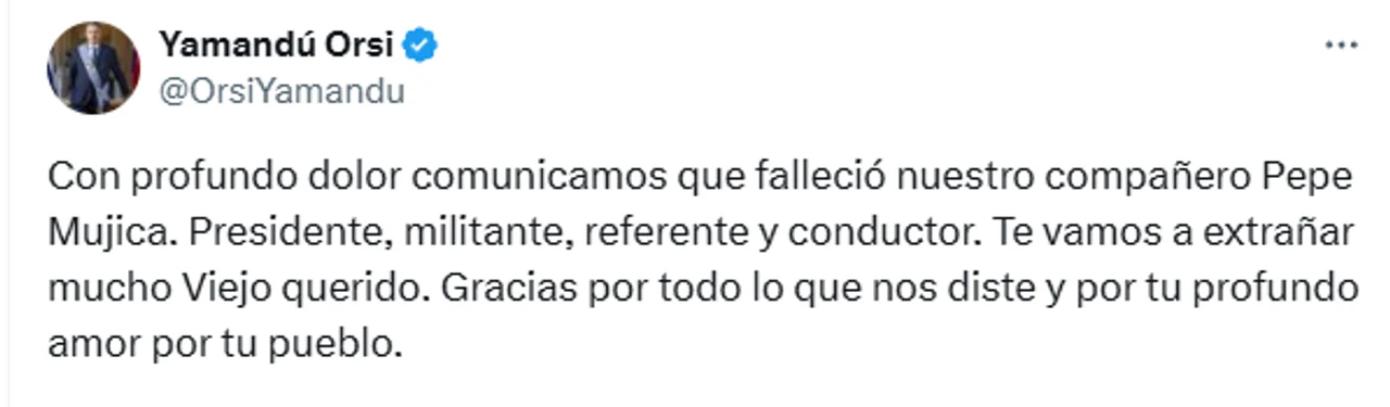 “Con profundo dolor comunicamos que falleció nuestro compañero Pepe Mujica. Presidente, militante, referente y conductor. Te vamos a extrañar mucho, viejo querido. Gracias por todo lo que nos diste y por tu profundo amor por tu pueblo”, escribió Orsi, acompañado por una imagen de luto.