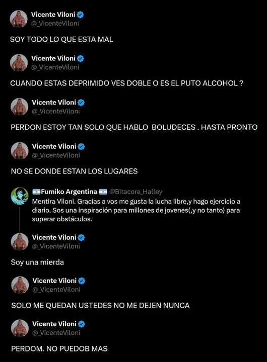La secuencia de tuits evidenció un estado de desorientación y tristeza profunda. «¿Cuando estás deprimido ves doble o es el puto alcohol?», se preguntó el luchador, para luego disculparse por su estado: «Perdón, estoy tan solo que hablo boludeces. Hasta pronto».