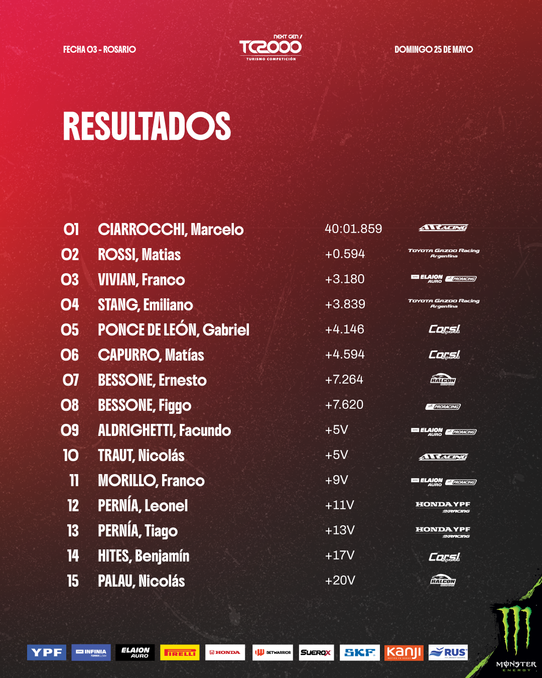 En un cierre electrizante que tuvo el ingreso del auto de seguridad por el golpe que sufrió Nicolas Traut en la curva 1, sin consecuencias físicas para el piloto de Las Flores, se agregó cinco minutos más de competencia donde Rossi buscó pasarlo al “Chelo” pero el cordobés prevaleció con autoridad para alcanzar su cuarto triunfo en la categoría. La última vez fue el 22 de septiembre de 2024 en Concepción del Uruguay, Entre Ríos. Además, la marca Fiat regresó a la victoria después de 3.178 días: la última fue el 25 de septiembre de 2016 en Toay, La Pampa, con Bernardo Llaver.