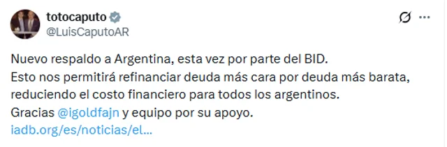 “Esto nos permitirá refinanciar deuda más cara por deuda más barata, reduciendo el costo financiero para todos los argentinos”, aseguró el ministro de Economía, Luis Caputo.