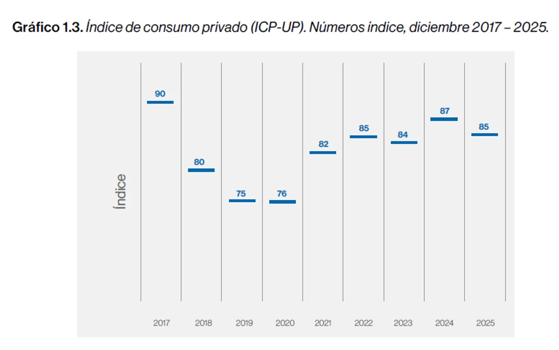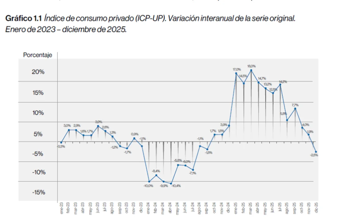 Las cifras corresponden al Índice de consumo privado (ICP-UP) que elabora la Universidad de Palermo (UP). De acuerdo a esta evaluación, el consumo privado bajó 1,0% en diciembre con respecto al mes anterior. Fue la tercera caída intermensual consecutiva.