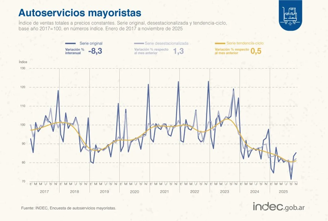 Las ventas totales a precios constantes registraron una caída del 2,8% interanual. Lo mismo ocurrió con la medición mensual: cayó 3,8% contra octubre. Este último dato fue la mayor caída desde diciembre de 2023.