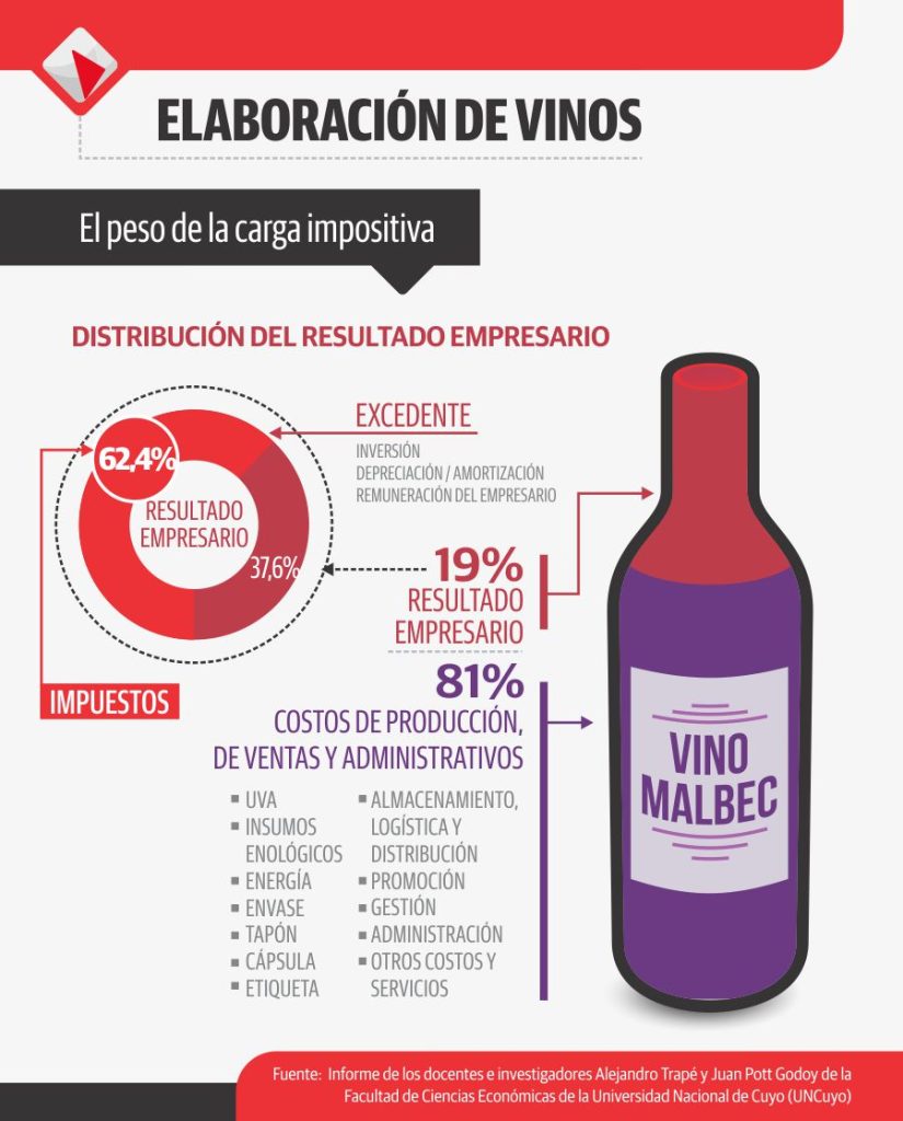 Otra forma de ver el peso de los impuestos es tomar el ejemplo de una bodega en Mendoza que tiene producción propia de uvas para vinificar.