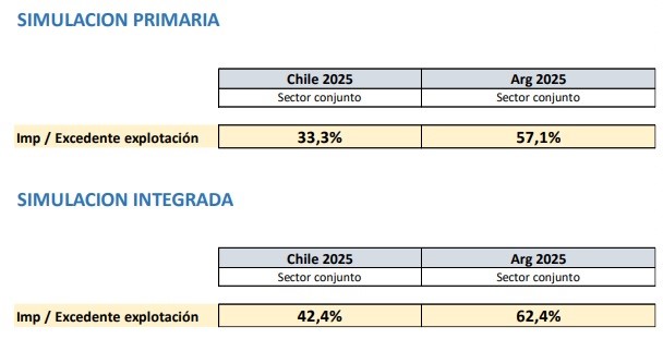 Según destaca el informe de la Facultad de Ciencias Económicas de la UNCuyo, supera la presión impositiva promedio para las actividades económicas de Mendoza (39%), la presión promedio nacional de Argentina que es del 37,7% sobre el excedente de explotación, e incluso la de Brasil (40,4%) y Chile (20,8%).