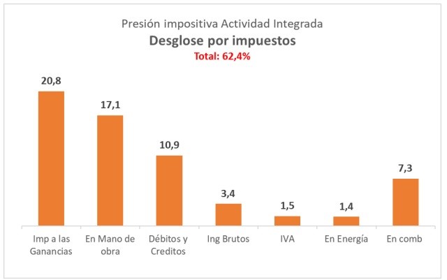 En este caso, sobre el total de ingresos (100%), los costos de producción, venta y administración se llevan el 81%, dejando un resultado empresario inicial del 19%. Sobre ese excedente de producción (19%), el pago de impuestos se lleva el 62,4%.