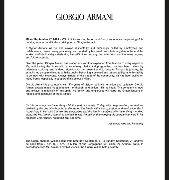 «En esta empresa, siempre nos hemos sentido parte de una familia. Hoy, con profunda emoción, sentimos el vacío dejado por quien fundó y nutrió a esta familia con visión, pasión y dedicación. Pero es precisamente en su espíritu que nosotros, los empleados y los miembros de la familia que siempre hemos trabajado junto al Sr. Armani, nos comprometemos a proteger lo que él construyó y a llevar su empresa adelante en su memoria, con respeto, responsabilidad y amor», indicaba el mensaje que la familia compartió en los medios.