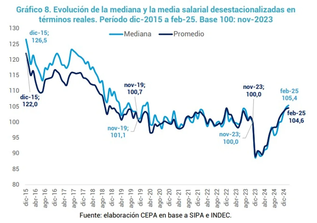 Las remuneraciones medidas por SIPA, tanto la promedio como la mediana, se ubicaron en febrero por encima del último mes de administración kirchnerista.