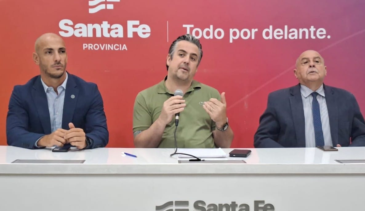 El ministro de Justicia y Seguridad de la provincia de Santa Fe, Pablo Cococcioni, junto a los secretarios de Seguridad Pública, Omar Pereira, y de Análisis y Gestión de la Información, Esteban Santantino, brindaron este viernes detalles sobre el plan integral para las fuerzas de seguridad que pondrá en marcha el Gobierno Provincial.