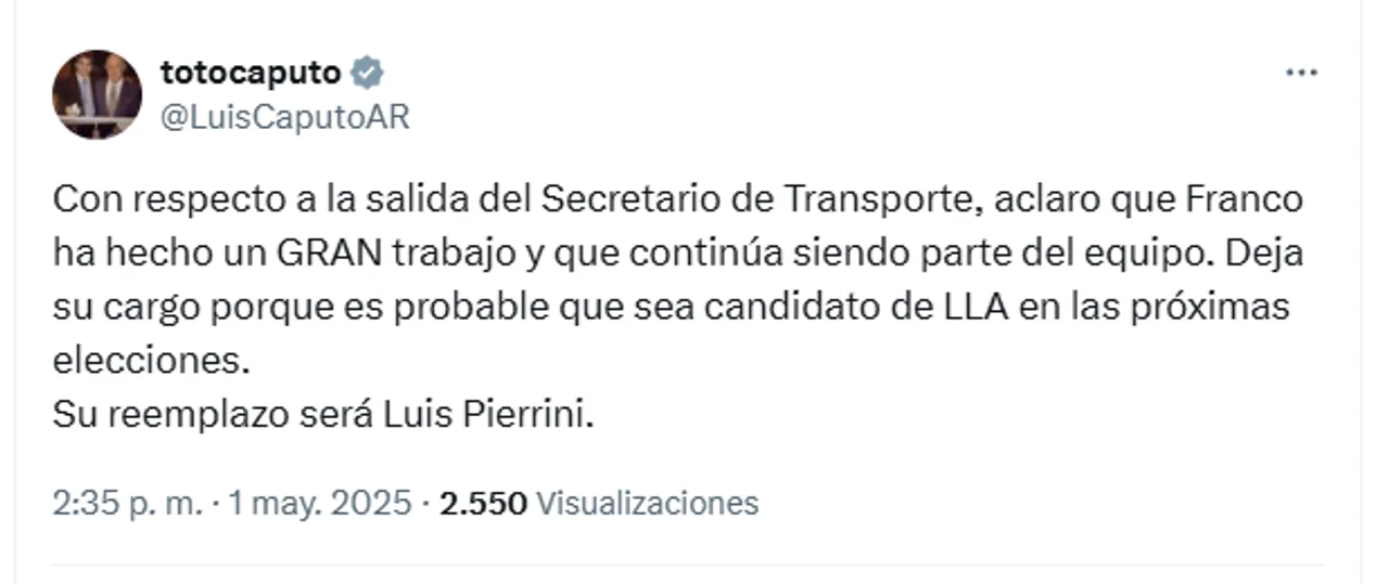 Algunos minutos más tarde, Luis Caputo publicó un tuit confirmando la versión: “Con respecto a la salida del Secretario de Transporte, aclaro que Franco ha hecho un GRAN trabajo y que continúa siendo parte del equipo. Deja su cargo porque es probable que sea candidato de LLA en las próximas elecciones. Su reemplazo será Luis Pierrini”, detalló.