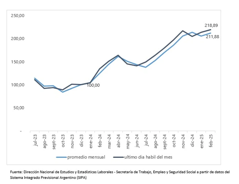 En la misma sintonía, desde el Ministerio de Capital Humano detallaron que la evolución del salario promedio en dólares, según la cotización del dólar de libre disponibilidad para las personas físicas, desde diciembre 2023, registró “un aumento de los salarios del 111,9% si se toma la cotización del promedio mensual y del 118,9% si se toma la cotización al último día hábil del mes”.