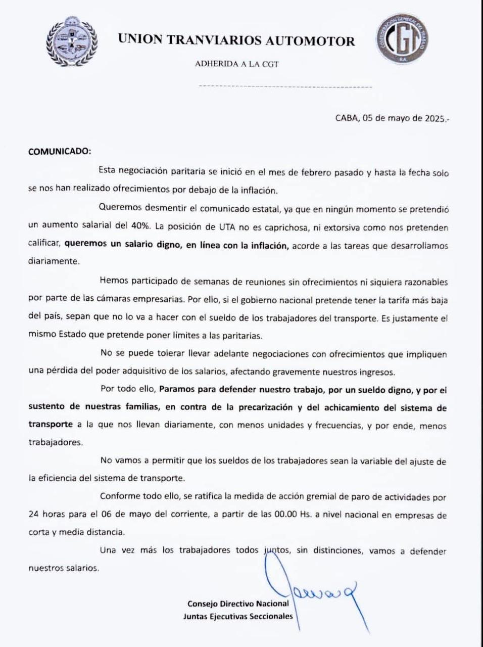 Este martes 6 de mayo no habrá servicio de colectivos en el Área Metropolitana de Buenos Aires (AMBA), luego del fracaso de la última instancia de diálogo entre el Gobierno nacional y la Unión Tranviarios Automotor (UTA). En Rosario, hubo una reunión por la tarde, donde el gremio local definió que se adhiere a la medida nacional.