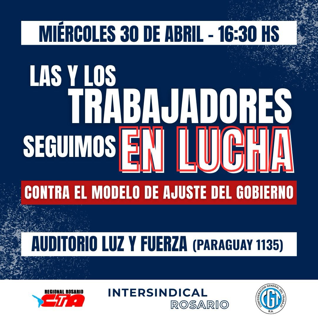 Este miércoles 30 se realizará un importante Plenario Intersindical en el Auditorio del Sindicato de Luz y Fuerza de Rosario (Paraguay 1135) en la antesala del Día de las y los Trabajadores.