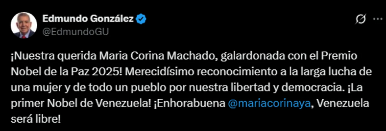 «¡Nuestra querida Maria Corina Machado, galardonada con el Premio Nobel de la Paz 2025! Merecidísimo reconocimiento a la larga lucha de una mujer y de todo un pueblo por nuestra libertad y democracia. ¡La primer Nobel de Venezuela!», escribió González Urrutia en su cuenta de X, junto al video de la llamada telefónica con Machado, quien exclama “¡Estoy en shock!”.