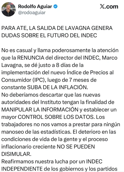 El secretario general de ATE, Rodolfo Aguiar, sostuvo que la renuncia de Marco Lavagna “genera dudas sobre el futuro del Indec” y consideró “no es casual” que se produzca “justo a ocho días de la implementación del nuevo Índice de Precios al Consumidor (IPC), luego de siete meses de constante suba de la inflación”.