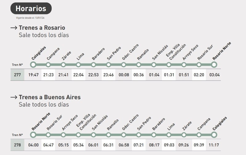 Los nuevos horarios indican que el tren 277 saldrá de Colegiales a las 19:47 y llegará a Rosario Norte a las 3:04 del día siguiente, mientras que el tren 278 partirá de Rosario Norte a las 4 y arribará a Colegiales a las 11:17.