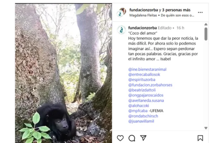 La triste noticia la anunció la Fundación Zorba, lugar donde el mono estaba viviendo, a través de sus redes sociales: “Coco del amor. Hoy tenemos que dar la peor noticia, la más difícil. Por ahora solo lo podemos imaginar así… Espero sepan perdonar tan pocas palabras. Gracias, gracias por el infinito amor”.