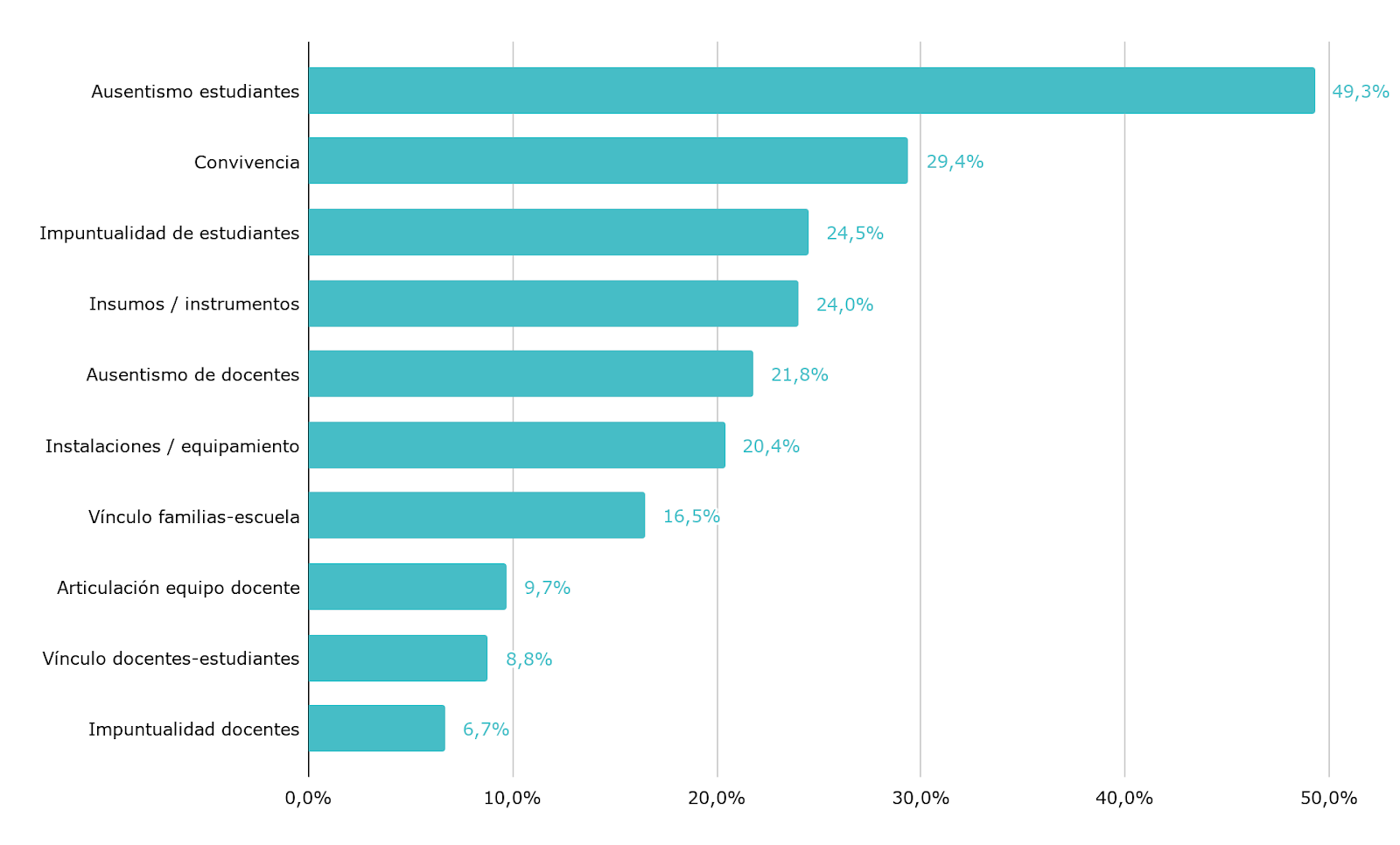 El informe muestra que el ausentismo estudiantil es percibido como el principal problema por los directores de escuelas primarias, por encima de otros factores como las dificultades de convivencia o la falta de recursos pedagógicos. De acuerdo con las pruebas Aprender 2023 de 6° grado, el 49,3% de los directores lo considera el factor que más afecta los procesos de enseñanza y aprendizaje.